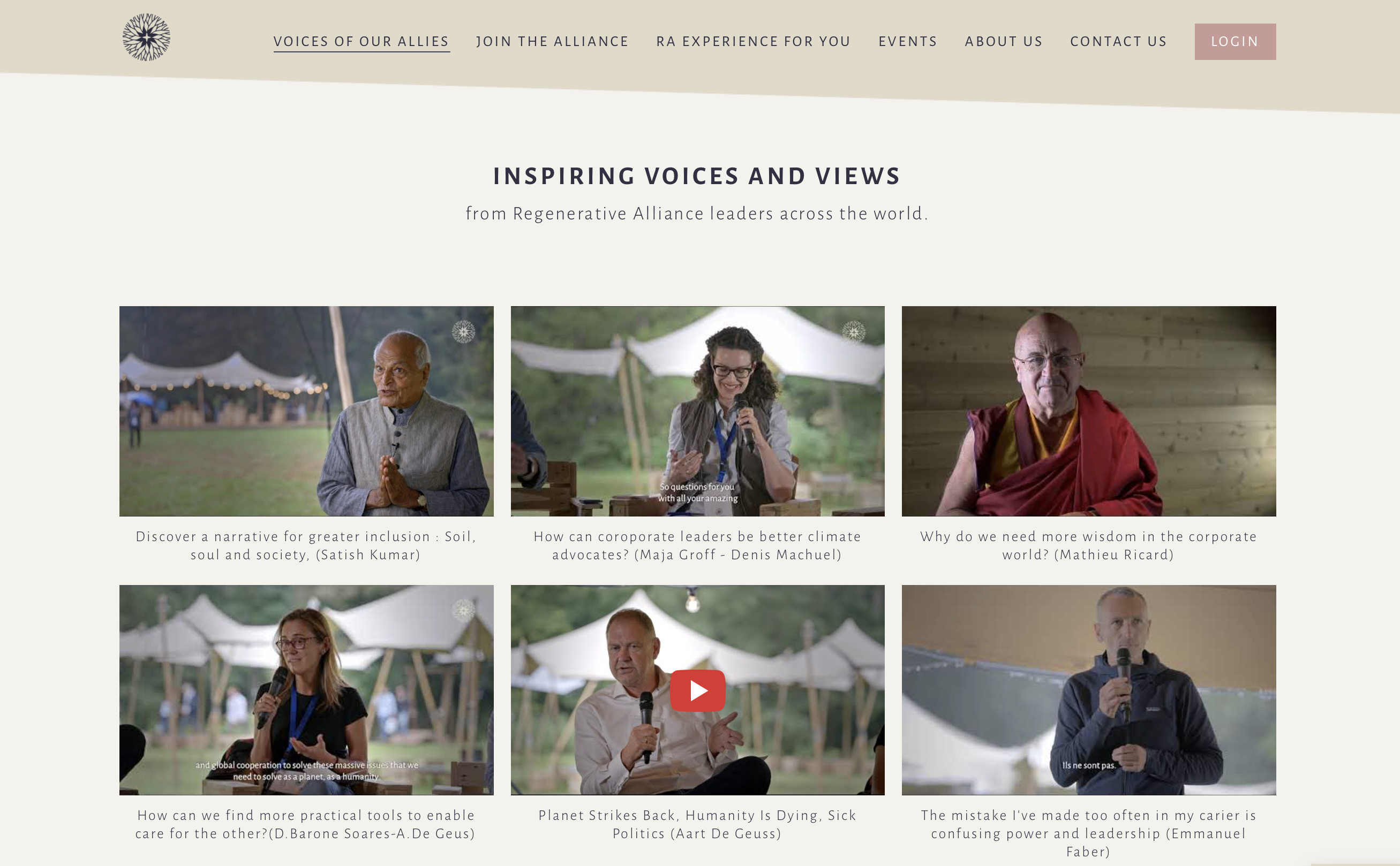 Between 2019 and 2021, Springtime managed communications, from the website, press relations and branding to the commercial brochure, LinkedIn recruitment, and written and audio-visual reporting. The resulting communications package led to two sold-out summits. The first attracted 110 CEOs while the second hosted 250 people. Summit participants had the chance to live in the heart of nature for the weekend and were challenged by philosophers, activists and entrepreneurs such as Bertrand Piccard, Emmanuel Faber, Sandrine Dixson-Declève, Satish Kumar, Nicolas Hulot, Gauthier Chapelle, Alexia Michiels, Guibert del Marmol or Frédéric Lenoir. Springtime and Regenerative Alliance already had common ground and shared viewpoints around sustainability, which led to sincere, authentic communication and openness to feedback; things that were welcomed by both parties.